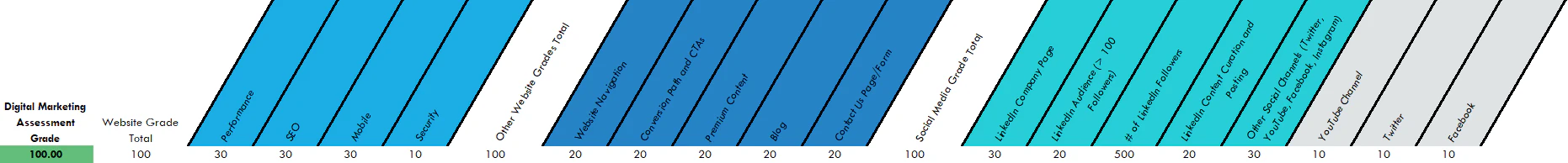 SEO = 0 | Conversion Paths & CTAs = 10 | LinkedIn > 100 Followers = 20 |